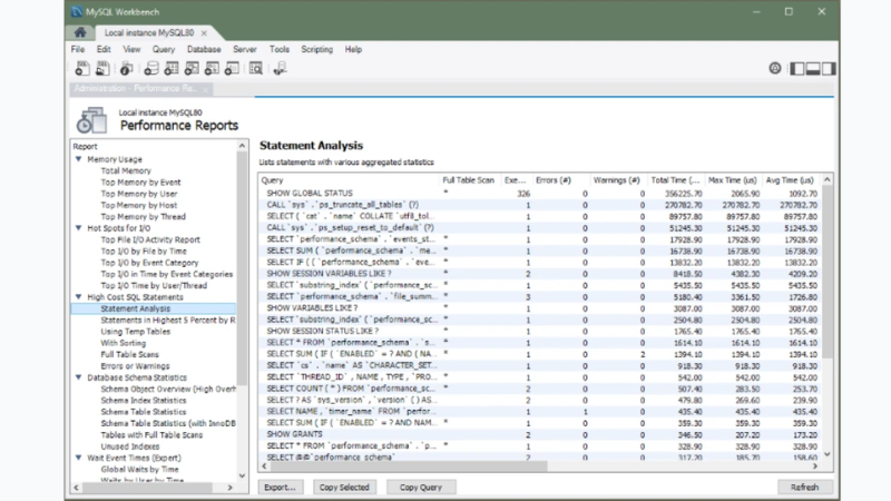 Alt text: MySQL Workbench Performance Reports interface showing Performance Schema statement analysis with query statistics and execution metrics.