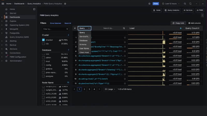 Alt text: Percona PMM Query Analytics dashboard showing MySQL query load, QPS metrics, and cluster-level filtering.