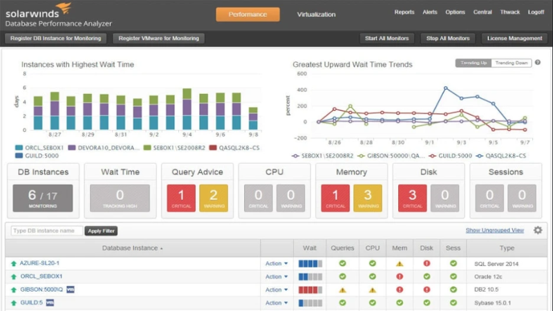 Alt text: SolarWinds Database Performance Analyzer dashboard showing wait time trends, query advice alerts, and instance-level performance monitoring.