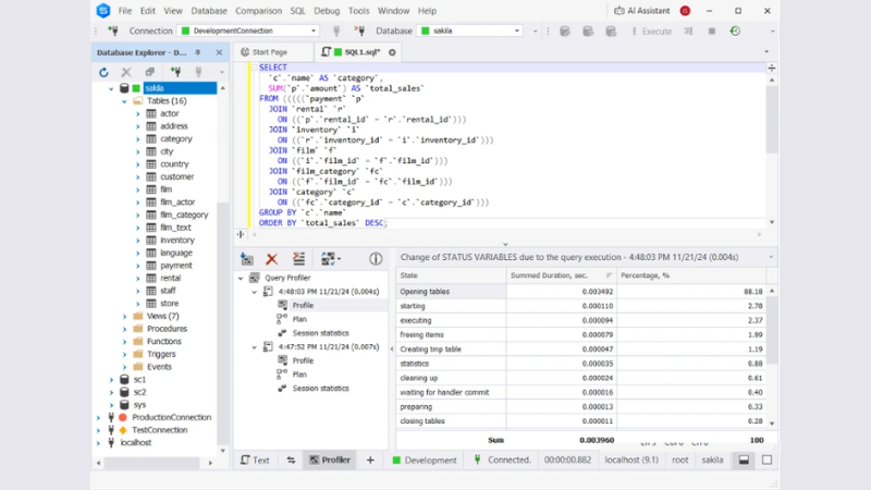 dbForge Studio for MySQL and MariaDB is a desktop MySQL IDE for Mac, Windows and Linux that integrates query profiling directly into the SQL development workflow. Unlike external monitoring platforms, it emphasizes iterative optimization within the coding environment, enabling developers and DBAs to analyze execution behavior and refine queries without leaving the IDE.